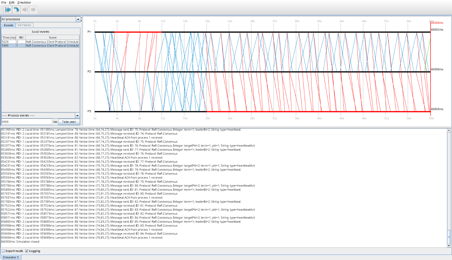 At 20000ms, P3 crashes. The cluster continues running with P2 as leader and P1 as follower for the rest of the 60-second simulation. The log remains dominated by periodic heartbeats from P2 and acknowledgments from P1, showing that the system stays stable even after a second failure.